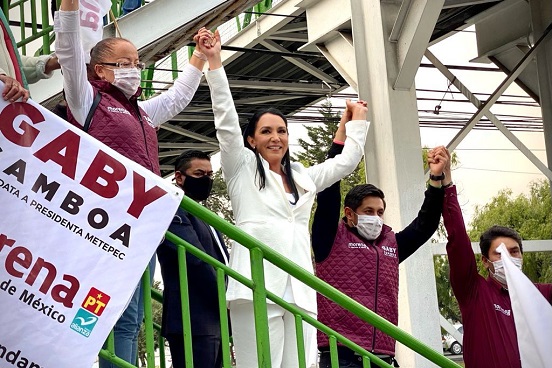 En la escalera del paso peatonal frente al Instituto Electoral del Estado de México (IEEM), Gaby Gamboa Sánchez tomó el megáfono para gritar con voz a cuello: “Este miedo que tiene Fernando Flores a debatir, sólo demuestra que carece de propuesta y que ¡ya ganamos!”