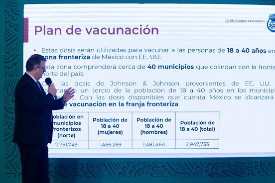 Durante la conferencia mañanera, el titular de la Secretaría de Relaciones Exteriores (SRE), Marcelo Ebrard, dijo que las dosis se aplicarán en 40 municipios de la franja fronteriza, lo que ayudará a levantar las restricciones sanitarias.