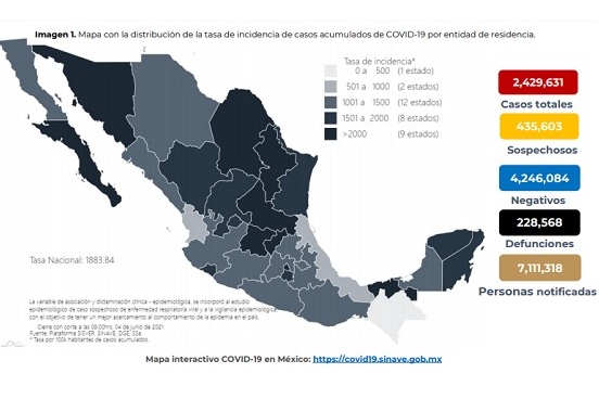 Según los números oficiales, hay 20 mil 525 casos activos en México -lo que representa un incremento respecto al viernes pasado, cuando había 19 mil 425 y 1 millón 936 mil 266 personas han superado la enfermedad. Se han registrado 228 mil 568 defunciones, 206 más que la víspera. Los casos confirmados incrementaron en 2 mil 809 para un acumulado de 2 millones 429 mil 631.