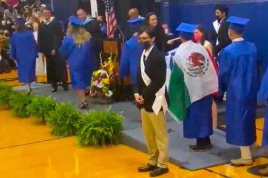 A un alumno de una secundaria de Carolina del Norte se le negó su diploma en la ceremonia de graduación debido a que colocó una bandera de México encima de su toga, lo cual violaba las normas de vestimenta, indicaron funcionarios escolares.