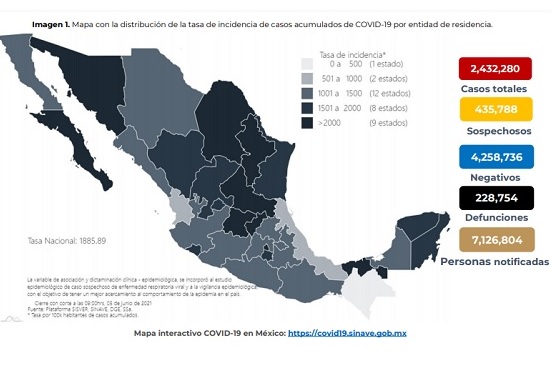 La Secretaría de Salud reportó un acumulado de 228 mil 754 muertes por Covid-19 desde que inició la pandemia, lo que significa 186 más que la víspera. Los casos confirmados incrementaron en 2 mil 649 para un acumulado de 2 millones 432 mil 280.