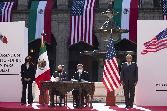 En el patio principal, los representantes de la Secretaría de Relaciones Exteriores y la Agencia de Estados Unidos para el Desarrollo Internacional (USAID por sus siglas en inglés), firmaron un memorándum de entendimiento para la cooperación internacional, con el fin de promover y fomentar las opciones en los países de Centroamérica en el tema migratorio.