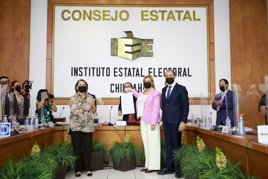 La abanderada de la coalición PAN-PRD, María Eugenia Campos Galván, recibió la noche de este domingo la constancia de mayoría que la acredita como gobernadora electa de Chihuahua, tras vencer en los comicios del pasado domingo 6 de junio.