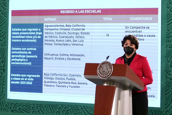 Durante la conferencia matutina, encabezada por el presidente Andrés Manuel López Obrador, detalló que los estados con clases presenciales son: Aguascalientes, Baja California, Chiapas, Ciudad de México, Coahuila, Durango, Estado de México, Guanajuato, Jalisco, Morelos, Nuevo León, San Luis Potosí, Tamaulipas y Veracruz; toda vez que en Campeche se encuentran suspendidas a causa del semáforo amarillo.