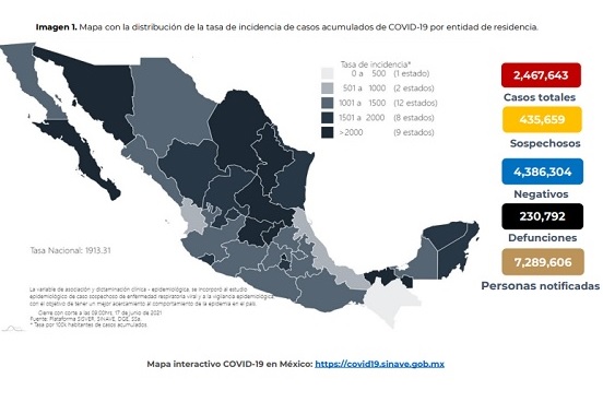La Ssa reporta 2 millones 467 mil 643 casos, con 4 mil 253 nuevos contagios confirmados. De los decesos, se reporta un acumulado de 230 mil 792, con 168 fallecimientos más que los notificados este miércoles.