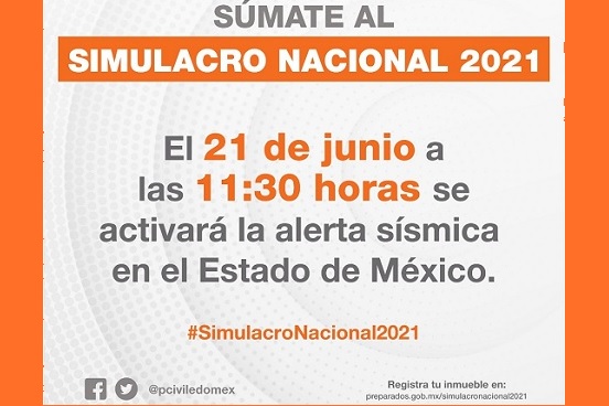 La Secretaría General de Gobierno, a través de la Coordinación General de Protección Civil, informó que el próximo lunes 21 de junio se llevará a cabo el Simulacro Nacional 2021, por esta razón, en punto de las 11:30 horas se activará la alerta sísmica en territorio mexiquense.