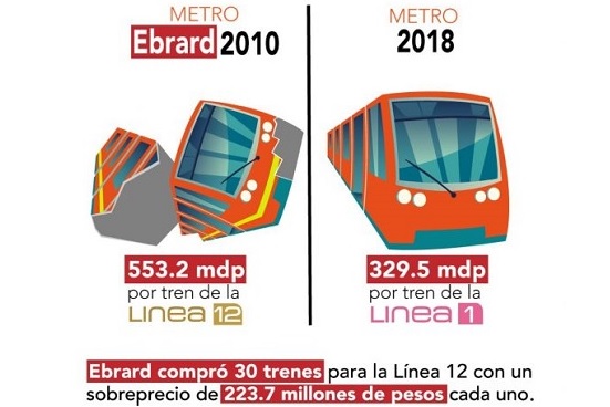 El Grupo Parlamentario del PAN dio a conocer que como Jefe de Gobierno en 2010, Marcelo Ebrard Casaubón compró con sobreprecio de 223.7 millones de pesos 30 trenes para la Línea 12. Lo anterior, con base en información de la Unidad de Transparencia de la Ciudad de México.