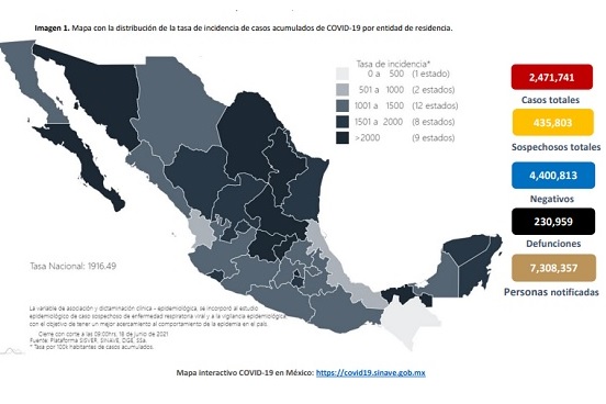 A la fecha, se registra un acumulado de 2 millones 471 mil 741 casos registrados desde que inició la emergencia sanitaria con 4 mil 98 más que la víspera y se han acumulado 230 mil 959 muertes a causa de la Covid-19, es decir, 167 más que el día anterior.