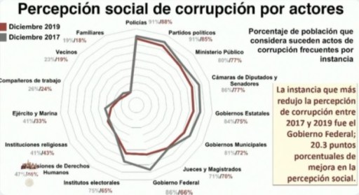 Posteriormente reveló un “reloj” en donde se reveló que la instancia que más redujo la percepción de corrupción entre 2017 y 2019 fue el Gobierno Federal; 20.3% de mejora en la percepción social. El Gobierno de México pasó de 86% a 66%; el Ejército y Marina de 41% a 33%.