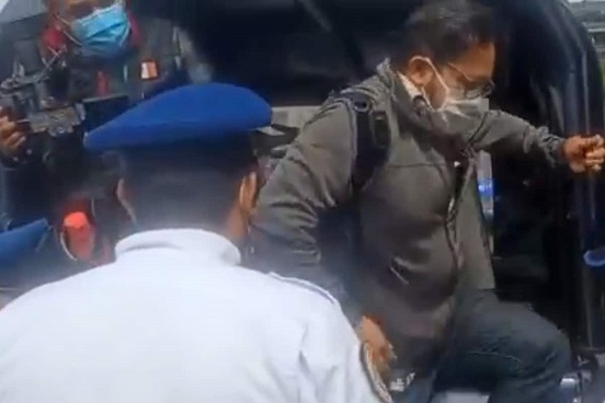 Uno de los presuntos detenidos señala que el vehículo no es apropiado para trasladarlos, a lo que un policía responde “por su seguridad debe ir adentro” y el reportero revira “por mi seguridad no debería ir”.