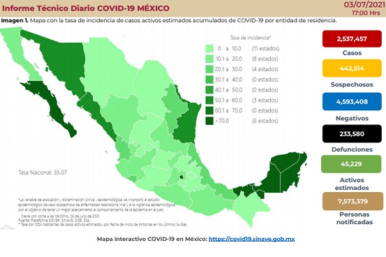 La Ssa reportó que hay 6 mil 228 casos confirmados adicionales a los notificados ayer, con un total de 2 millones 537 mil 457. Los decesos tuvieron un incremento de 155, con un acumulado de 233 mil 580. Informó que son 2 millones 10 mil 754 las personas que han superado la enfermedad.