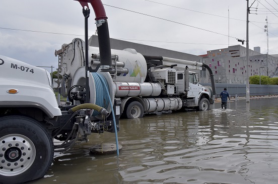 En total, durante la jornada del viernes, el Grupo Tláloc trabaja con 10 equipos de bombeo, 10 de presión succión, tres camiones de volteo, tres tipo cisterna, dos minicargadores y una retroexcavadora.