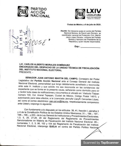 Tras la difusión de los videos donde se ve a Martín Jesús López Obrador, hermano del Presidente de la República, recibiendo dinero de David León, excoordinador nacional de Protección Civil, el Grupo Parlamentario del Partido Acción Nacional (GPPAN), representado por el senador Juan Antonio Martín Del Campo, interpuso una queja ante el Instituto Nacional Electoral (INE) en contra del Partido Político Nacional Morena, los implicados, así como a quien resulte responsable.