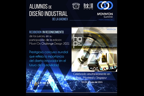 Reconocer la movilidad como un derecho humano llevó a cinco estudiantes y un docente de la Licenciatura en Diseño Industrial de la Facultad de Arquitectura y Diseño de la Universidad Autónoma del Estado de México (UAEM) a participar en el Movin’On Challenge Design 2021, cuyo jurado los distinguió por la propuesta “Hope”, presentada en el marco del reto internacional.