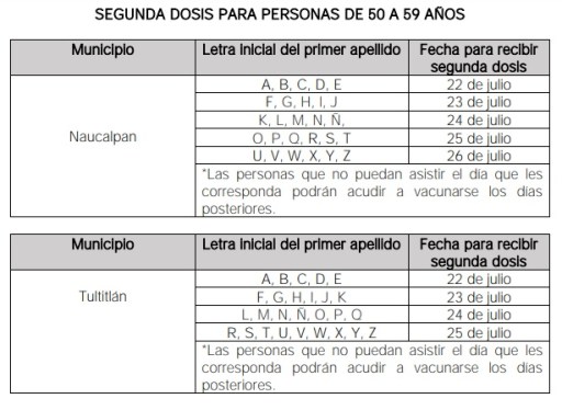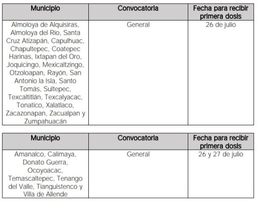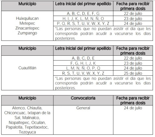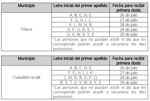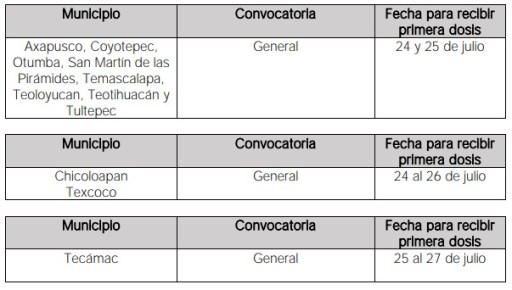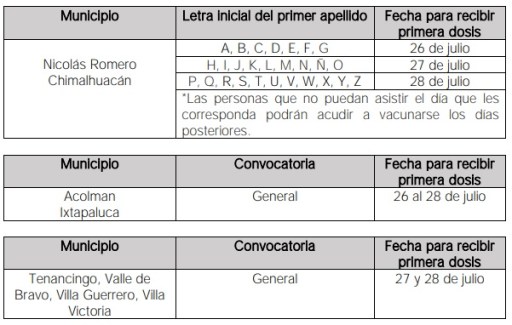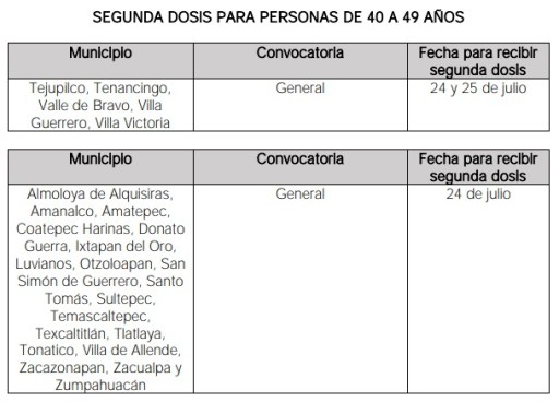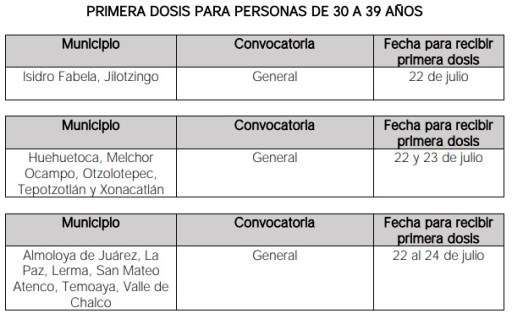 Como parte de la Estrategia Conjunta de Vacunación que llevan a cabo los Gobiernos de México y del Estado de México, en coordinación con los ayuntamientos mexiquenses, a partir del próximo jueves 22 de julio inicia la aplicación de la primera dosis del biológico contra COVID19 a personas de 30 a 39 años en 79 municipios, segunda dosis al grupo de 40 a 49 años en 24, así como segunda dosis a adultos de 50 a 59 años en 11 municipios más.