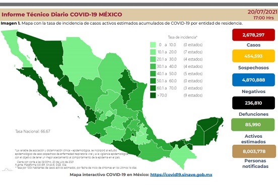En cuanto a los casos confirmados, la cifra se elevó en 13 mil 853, con un total de 2 millones 678 mil 297, mientras que los decesos aumentaron en 341, con un acumulado de 236 mil 810.