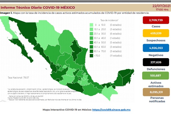 Los contagios confirmados se elevaron en 16 mil 244, con un total de 2 millones 709 mil 739. Los decesos también tuvieron un incremento, con 419 notificaciones más que las reportadas este miércoles, con un acumulado de 237 mil 626.
