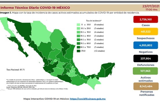 Respecto al avance en vacunación, con corte de las 21:00 h del jueves 22 de julio se aplicaron un millón 376 mil 213 dosis, para un acumulado de 58 millones 249 mil 143 biológicos desde el 24 de diciembre del 2020.