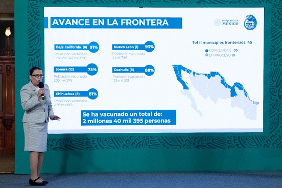 “Están concluidos 35 de los 45 municipios fronterizos y están en proceso 10. A la fecha se han vacunado un total de 2 millones 40 mil 395 personas de 18 años de edad en adelante en esta zona fronteriza del norte del país”, expuso.
