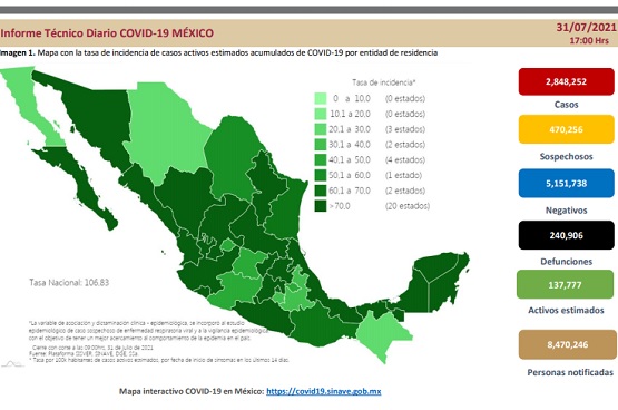 En el reporte técnico sobre la evolución de la epidemia en el país de este sábado, la Secretaría de Salud consigna que con esto, se han acumulado 2 millones 848 mil 252 casos confirmados desde que inició la crisis sanitaria, así como 240 mil 906 fallecimientos.