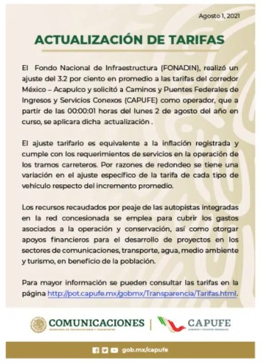 Caminos y Puentes Federales de Ingresos y Servicios Conexos (Capufe) aumentó 3.2 por ciento las tarifas de peaje en la Autopista del Sol, a partir de este lunes.