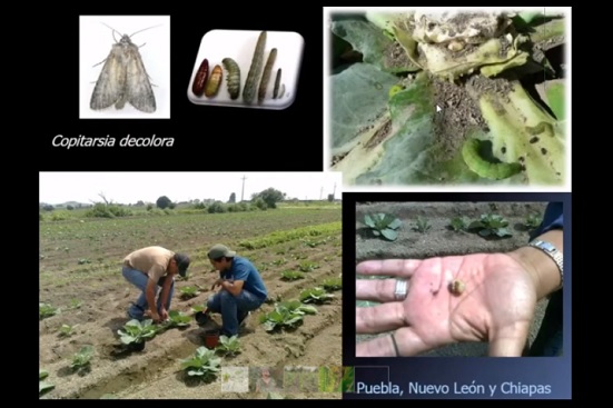 Señaló que en el Laboratorio de Ecología Química e Insectos, del Departamento de Interacciones Planta-Insecto, del CEPROBI, se han estudiado varias especies de importancia agrícola, como la mosca de la fruta de la papaya (Anastrepha curvicauda), el grupo de escarabajos conocidos como gallina ciega (Phyllophaga obsoleta, Cyclocephala lunulata y Cyclocephala barrerai), la palomilla del corazón de la col (Copitarsia decolora), el picudo del nardo y agave(Scyphophorus acupunctatus), el gusano cogollero del maíz (Spodoptera frugiperda) y la chinche pata de hoja (Leptoglossus zonatus).