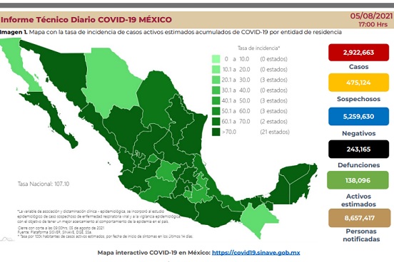 En la actualización del estado de la pandemia de Covid-19 en México, detalla que los casos activos estimados, es decir con capacidad de transmisión, 138 mil 96, mientras que el alza en la curva epidémica se mantiene constante, con un incremento de 22 por ciento en los casos estimados en el periodo del 18 al 24 de julio, en comparación con la semana epidemiológica previa.
