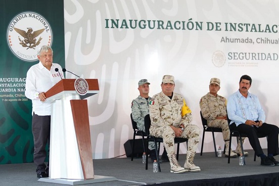 López Obrador encabezó la inauguración de instalaciones de la Guardia Nacional en Villa Ahumada, Chihuahua, la tarde de este sábado junto con el gobernador de la entidad, Javier Corral, así como de los titulares del gabinete federal de seguridad, tanto de la Secretaría de este cuerpo de seguridad, de la Secretaría de la Defensa Nacional, de Marina y de Seguridad y Protección Ciudadana.