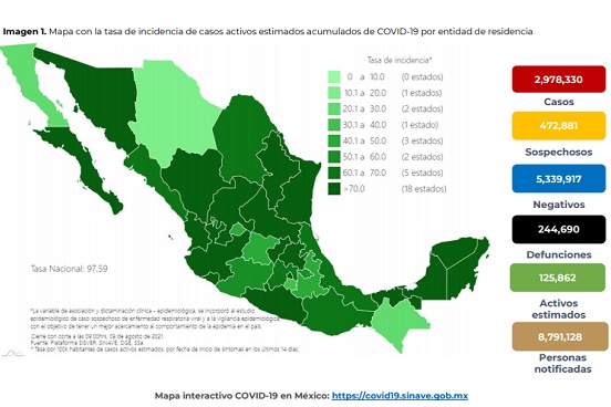 Mientras tanto, las entidades que más casos activos, es decir, aquellos positivos que iniciaron síntomas en los últimos 14 días son: la Ciudad de México, el Estado de México, Nuevo León, Jalisco, Veracruz, Tabasco, San Luis Potosí, Guerrero, Quintana Roo, Puebla, Nayarit, Sonora, Michoacán, Guanajuato, Colima, Tamaulipas, Oaxaca, Querétaro, Hidalgo, Sinaloa, Coahuila, Yucatán, Durango, Baja California Sur, Chiapas y Zacatecas, y todas concentran el 96% de los casos activos del país.