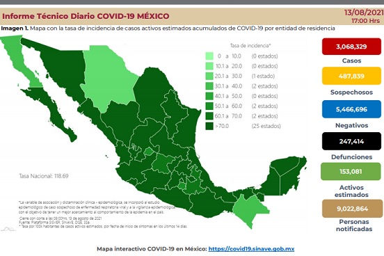Los casos con capacidad de transmisión conservan su tendencia al alza. Se notificaron 153 mil 81 casos activos estimados, es decir, se reportó un incremento de 6 mil 556 contagios en 24 horas, mientras que la curva epidémica incrementó en 5 por ciento los casos estimados del 25 al 31 de julio, en comparación con la semana epidemiológica previa.