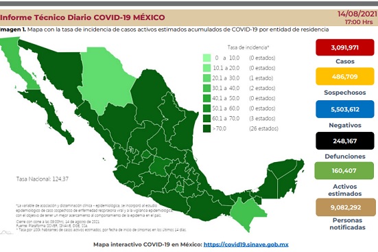 La Ssa reportó este sábado 23 mil 642 nuevos casos Covid-19 para un total de 3 millones 91 mil 971 contagios registrados. Los fallecimientos incrementaron en 753 para un acumulado de 248 mil 167.