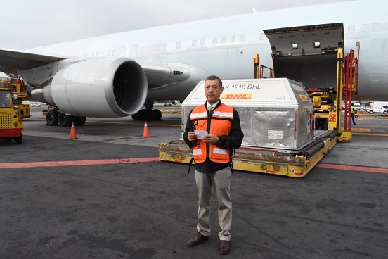 El embarque número 65 de la farmacéutica llegó a las 8:55 h a la terminal 1 del AICM, en el vuelo CVG MX952, procedente de Cincinnati, Estados Unidos. En el arribo, traslado y seguridad de las vacunas participaron 58 elementos del Ejército Mexicano.
