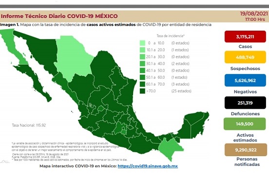 La dependencia federal detalló que hasta este jueves se tienen registrados 138 mil 27 casos activos con una tasa de incidencia de 107.02 por 100 mil habitantes (en el periodo del 6 al 19 agosto del 2021).