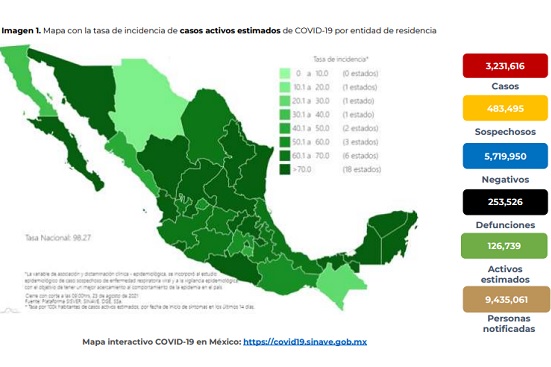 El reporte sobre el comportamiento de la pandemia de Covid-19 en México indica que entre domingo y lunes se confirmaron 6 mil 543 casos de la enfermedad y 371 fallecimientos, para un acumulado de 3 millones 231 mil 616 personas que han tenido la infección y 253 mil 526 que han perdido la vida.
