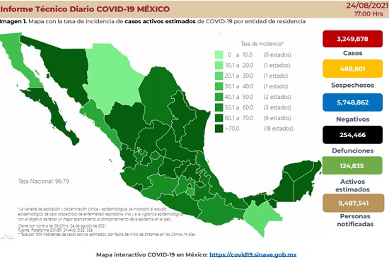 Este martes México reportó un total de 3 millones 249 mil 878 casos acumulados de Covid-19, es decir 18 mil 262 más que un día antes y hasta ahora han fallecido 254 mil 466 personas de esta enfermedad, lo que significa 940 más que las reportadas el lunes.