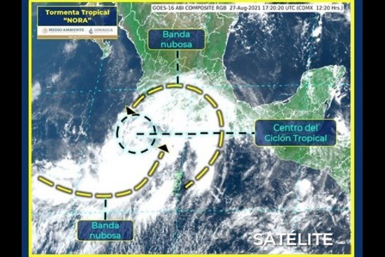La amplia Tormenta Tropical Nora con radio de 370 kilómetros, avanza muy cerca de la costa a 400 kilómetros al sur de Manzanillo, Colima, con vientos máximos sostenidos de 85 kilómetros por hora y ráfagas de 100 kilómetros por hora.