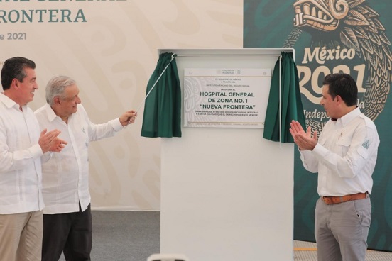 Al encabezar la inauguración del Hospital General de Zona No.1 Nueva Frontera en Tapachula, Chiapas, el jefe del Ejecutivo resaltó que esas instalaciones ya están en funcionamiento e incluso ahí han atendido a personas enfermas de COVID-19.