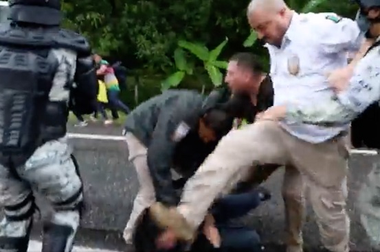 En otra escena que también generó indignación en México, miembros de la Guardia Nacional (GN) golpearon con sus escudos a un migrante que cargaba a una menor de edad en medio de la lluvia, para impedirle seguir el paso de la caravana.