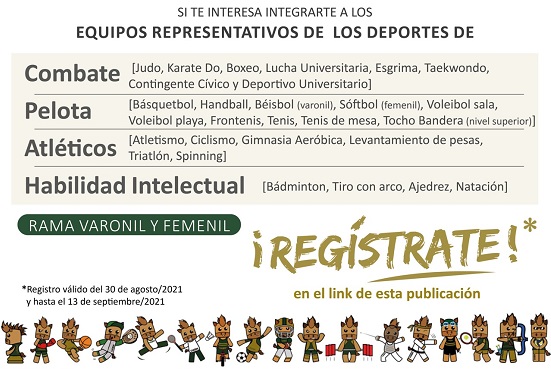 Para integrar los equipos deportivos de la Autónoma mexiquense, las y los universitarios interesados de los niveles medio superior y superior podrán registrarse antes del próximo 13 de septiembre en la liga: https://tinyurl.com/DeportesUAEMex.