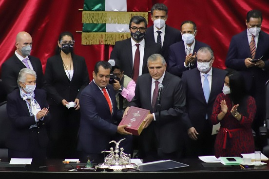 Enseguida, en el salón de sesiones, el presidente del Congreso de la Unión y de la Cámara de Diputados, Sergio Carlos Gutiérrez, recibió del secretario de Gobernación, Adán Augusto López Hernández, el Tercer Informe de Gobierno del Presidente Andrés Manuel López Obrador.