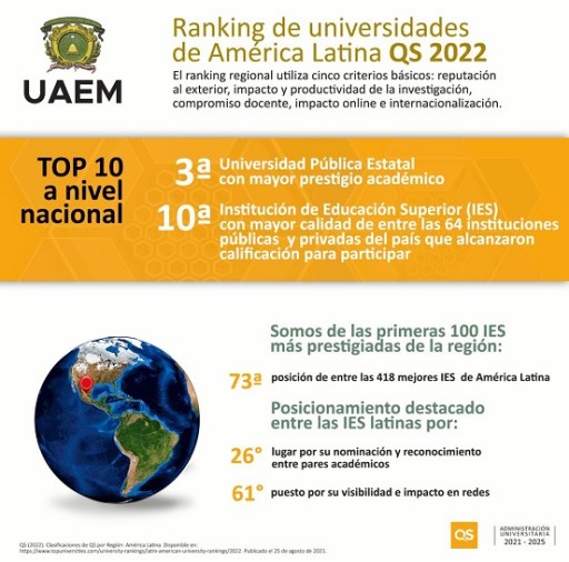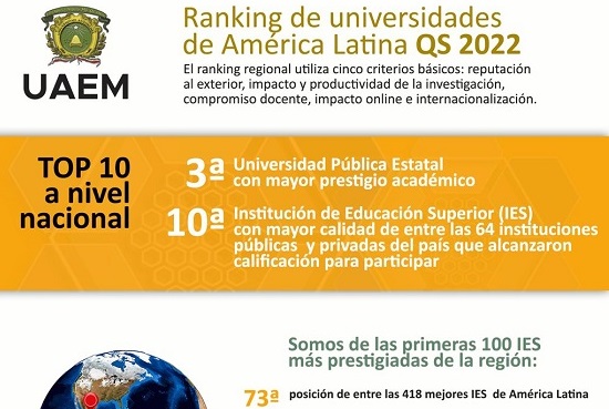 La Universidad Autónoma del Estado de México (UAEM) se consolidó como la tercera mejor universidad pública estatal a nivel nacional, de acuerdo con el Ranking de Universidades de América Latina QS 2022, que recientemente dio a conocer los resultados anuales de su evaluación.