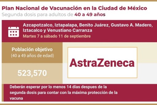 A partir del martes 7 de septiembre se continuará con la vacunación en la Ciudad de México y tocará el turno de segundas dosis a más de 523 mil personas de 40 a 49 años que radican en las alcaldías de Azcapotzalco, Iztapalapa, Benito Juárez, Gustavo A. Madero, Venustiano Carranza e Iztacalco.