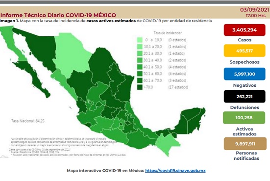 En su reporte técnico diario sobre la evolución de la epidemia, la SSa indicó que se han acumulado 3 millones 405 mil 294 casos confirmados y 262 mil 221 defunciones desde que inició la crisis sanitaria.