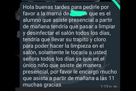 De acuerdo con la publicación, la profesora Edna solicitó a la madre del niño limpiar y desinfectar el salón diario con sus propios materiales. “Solamente le tocaría a usted, señora, todos los días ya que es el único niño que asiste de manera presencial”, presuntamente dijo la educadora.