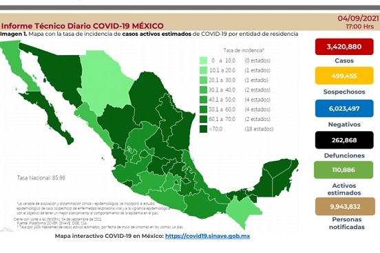 En 24 horas se confirmaron 15 mil 586 casos nuevos casos de Covid-19 y 647 defunciones a causa de la enfermedad. Con esto, se han acumulado 3 millones 420 mil 880 casos y 262 mil 868 muertes desde que inició la crisis sanitaria.