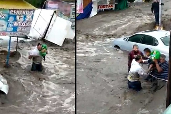 En medio de las inundaciones ocurridas en el municipio de Ecatepec en redes sociales fueron compartidas unas imágenes en las que se muestran como es rescatado un bebé que fue arrastrado por la corriente de agua.