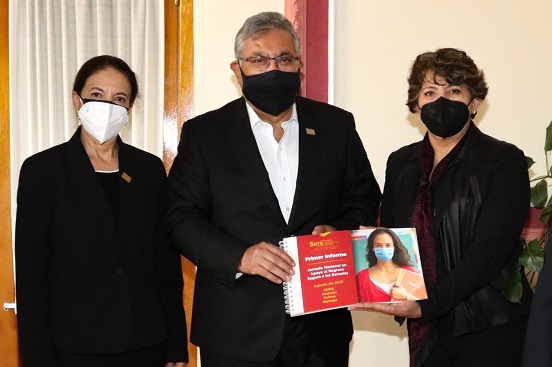 La secretaria de Educación Pública, Delfina Gómez Álvarez, recibió del secretario general del Sindicato Nacional de Trabajadores de la Educación (SNTE), Alfonso Cepeda Salas, el Primer Informe de la Jornada Nacional en Apoyo al Regreso Seguro a las Escuelas, correspondiente al mes de agosto de 2021.