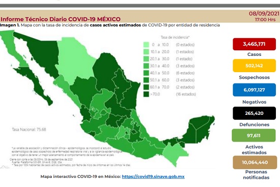 Para este día los casos activos estimados ascienden a 97 mil 611 y la cantidad de individuos con sospechosa de tener la infección por el virus SARS-CoV-2 son 502 mil 142. Estos son aquellos que tienen síntomas pero no se ha realizado la prueba de laboratorio correspondiente.