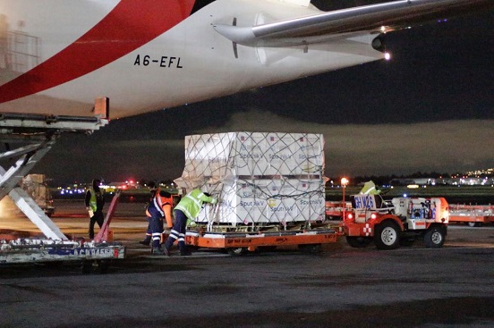 A las 3:20 h llegó a la terminal 1 del Aeropuerto Internacional de la Ciudad de México (AICM) “Benito Juárez”, el décimo cuarto embarque de esta farmacéutica en el vuelo EK9935, procedente de Moscú, Rusia, con escala en Frankfurt, Alemania.