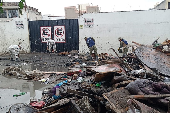 En coordinación con autoridades federales, estatales y municipales, elementos de la GN realizan la remoción del escombro que aún permanece en viviendas, comercios y en la vía pública, a consecuencia de las fuertes lluvias registradas la semana pasada.